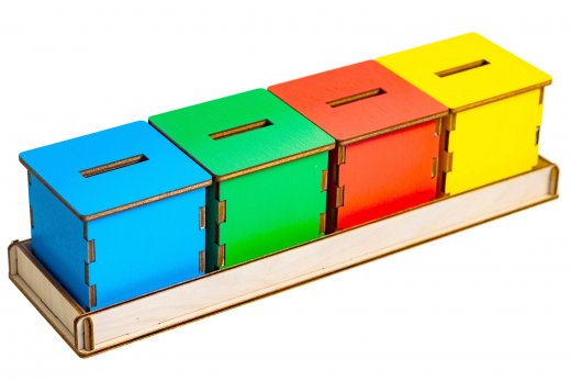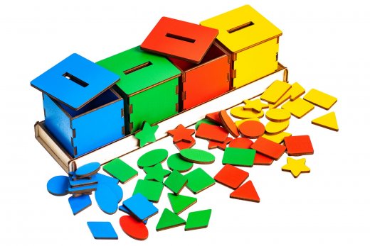 1. Игра «Домики». Рассмотрите цветные коробочки («домики») вместе с ребенком, назовите цвет каждого «домика», какие геометрические фигуры спрятаны внутри. Затем предложите ребенку самостоятельно заполнить «домик» геометрическими фигурками, вставляя их в специальные прорези на крыше домика.