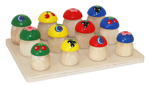 В комплект входит деревянная платформа и 12 грибочков разной формы и размеров (крепятся к платформе). Изделие ярко раскрашено и привлечет внимание ребенка в возрасте от одного года и старше.