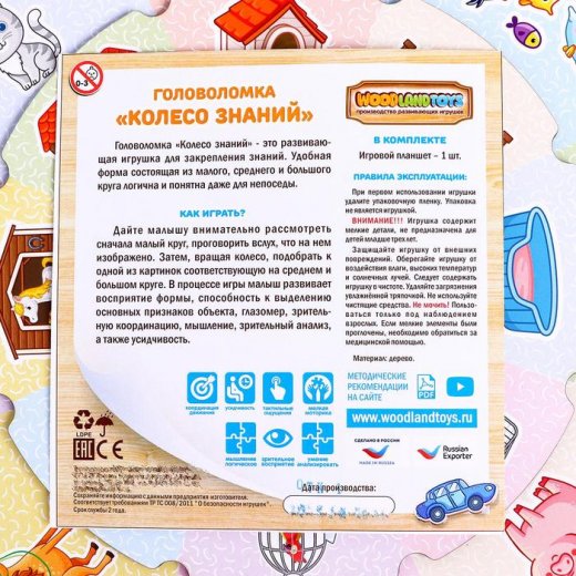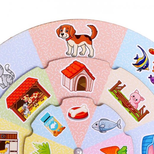Игра состоит из трёх кругов разного диаметра, соединённых в центре. Каждый круг подвижен и разделен на сектора. На нижнем кольце изображены домашние животные, на среднем - места их жительства, а сверху – различная пища для домашних животных.