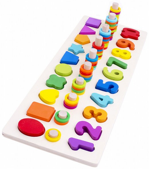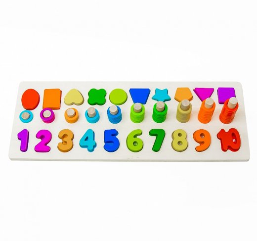 В набор входят деревянные цифры с арифметическими знаками, значение которых должно совпадать с количеством колец надетых на штырьки разной длины напротив цифры. Сначала можно искать подходящее очертание и вкладывать туда детали, изучать цвета, сортируя колечки по штырькам по цветам, и понятия «больше-меньше», а потом обучать малыша счету при помощи колечек-пирамидок и цифр. Игра отлично помогает в обучении счету. Дополнительное развлечение - геометрические фигуры разных цветов, которые также выступают элементом сортера, ведь их нужно вставить в правильную форму и составить в продолжение цвета в ряду. Связь мелкой моторики и логики даёт прекрасную базу для лучшего запоминания за счёт стимулирования близь лежащих зон мозга.
