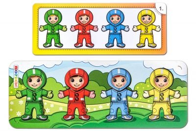 - Игра «Подбери костюм». Рассмотрите вместе с ребенком все карточки и предложите выбрать одну из них. Обратите внимание на цвет деталей одежды малышей на карточке. Предложите ребенку самостоятельно подобрать костюм для каждого малыша, ориентируясь на карточку-образец.