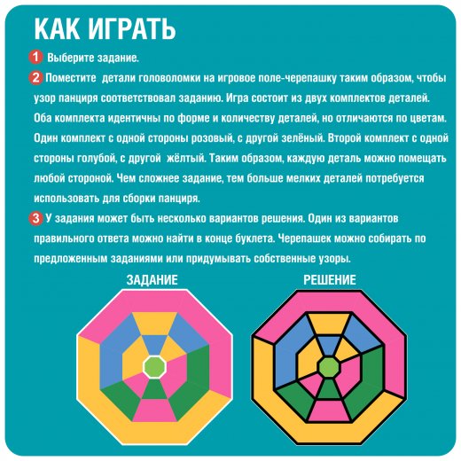 В комплекте: игровое поле в виде черепашки, 2 комплекта двухслойных двухцветных деталей для панциря разной формы, буклет с 48 заданиями и 4 уровнями сложности.