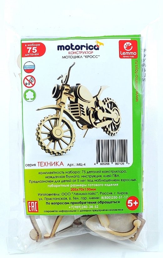 Конструктор Lemmo Мотоцикл Кросс – подойдет мальчикам, которые любят собирать своими руками различные виды техники. Собрав 75 деталей, ребенок получит отличную модель мотоцикла с вращающимися колесами и подвижным рулем. Все детали выполнены из качественной древесины и имеют сильный насыщенный запах дерева. Наборы укомплектованы клеем ПВА и наждачной бумагой. Конструктор после сборки можно раскрасить акриловыми и гуашевыми красками, но даже без этого в результате получается полноценная красивая игрушка с подвижными элементами.