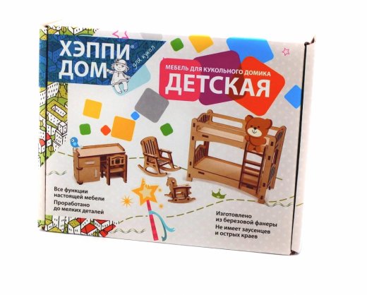 Набор мебели «Детская» создан специально для одной из комнат Конструктора «Кукольный дом». Мебель выполнена из березовой фанеры, но небольшие детали, например, ручки на дверцах, сделаны из пластика. Все элементы собираются без клея, просто вставляются в пазы, крепление очень прочное и надежное.