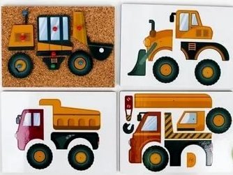 Состав набора: деревянный ящик для хранения, пробковое полотно, 4 варианта сборной мозаики, деревянный молоток, 16 металлических гвоздиков с пластиковой насадкой, схемы сборки