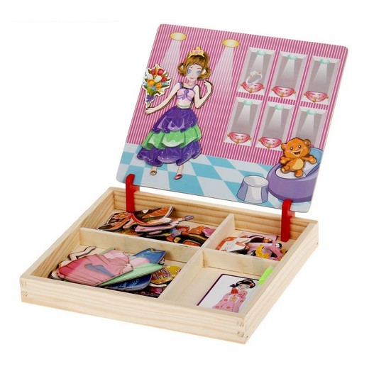 Конструктор магнитный "Принцесса"- великолепный подарок для маленькой модницы. Игровой набор сделан в форме деревянной коробки, внутри которой вы найдете карточки-подсказки с изображениями нарядных девочек, магнитные детали, из которых нужно собрать готовые картинки - нарядить девочку и маркер для рисования на доске. При игре можно как ориентироваться на подсказки в наборе, так и создавать свои собственные шедевры. На магнитной доске малыш может играть с картинками, а так же рисовать маркером, входящим в комплект. Коробку с конструктором удобно брать в дорогу, чтобы ребёнок не скучал во время длинного путешествия.