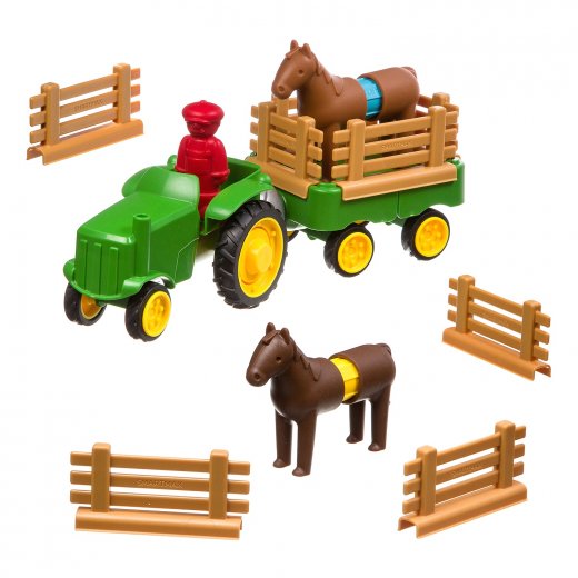 Состав набора: разборные фигурки лошади, фигурка фермера, длинные соединительные штыри, короткие штыри, магнитный шарик, большие детали изгороди, малые детали изгороди, разборная тележка, разборная кабина трактора.