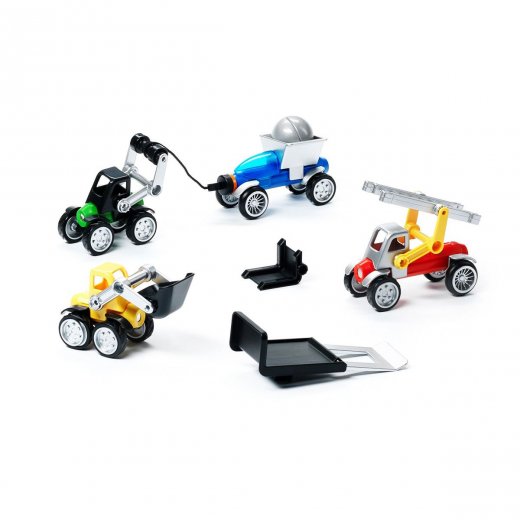 Из деталей набора можно построить целый автопарк! Собрать бульдозер, пожарную машину, погрузчик, эвакуатор, внедорожник-пикап или минивэн! Кабины, ковши, колеса и другие детали машины легко крепятся на магнитных палочках конструктора.