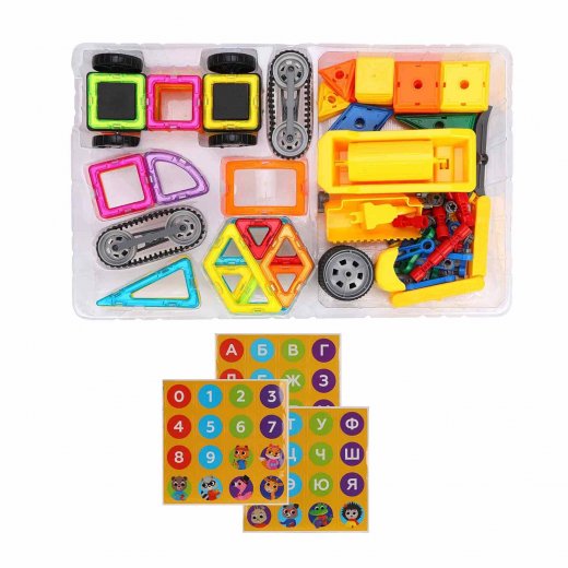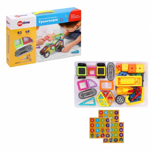 Конструктор магнитный Транспорт. Магнитный конструктор «Транспорт» от торговой марки ON TIME поможет ребёнку научиться собирать огромное количество различных видов машин, а также дома и другие фигуры. При создании фигур маленький строитель может следовать инструкции или руководствоваться собственной фантазией. Яркие пластмассовые детали разных цветов легко соединяются друг с другом, их удобно и легко держать детской ручкой. Занимаясь конструированием, ребёнок будет развивать воображение и пространственное мышление, мелкую моторику рук и способность классифицировать объекты по форме и цвету. К игровому набору можно возвращаться снова и снова, создавая новые комбинации форм и фигур. Он включает 92 детали (из них 36 элементов со встроенными магнитами и 56 элементов без магнитов), 1 красочную иллюстрированную инструкцию, а также 48 наклеек с буквами русского алфавита, цифрами и животными, предназначенных для украшения элементов конструкций. Изготовлено из полимерных материалов.
