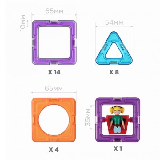 Набор «Basic Plus 26 Set + Девочка» может стать самым первым Магформерс или расширить вашу магнитную коллекцию. Он дополнен фигуркой девочки.