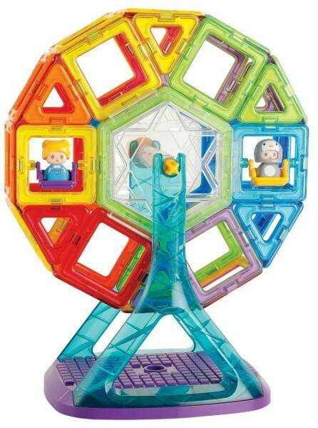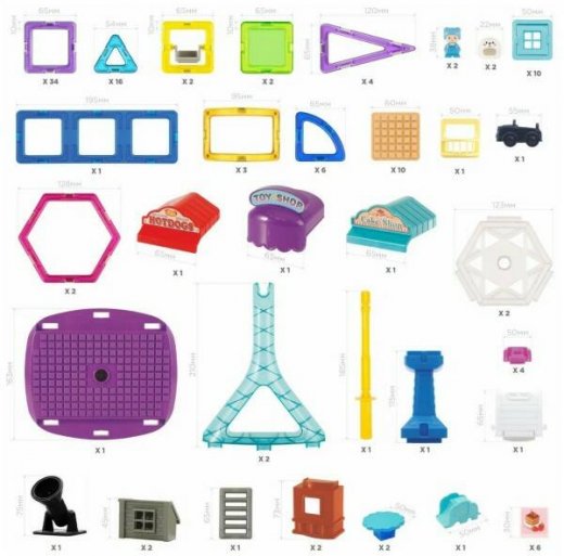 В наборе Magformers Fantasy Land Set представлены самые популярные аксессуары, включая детали для сборки карусели и строительные аксессуары, а также фигурки забавных человечков со съемными шапочками.