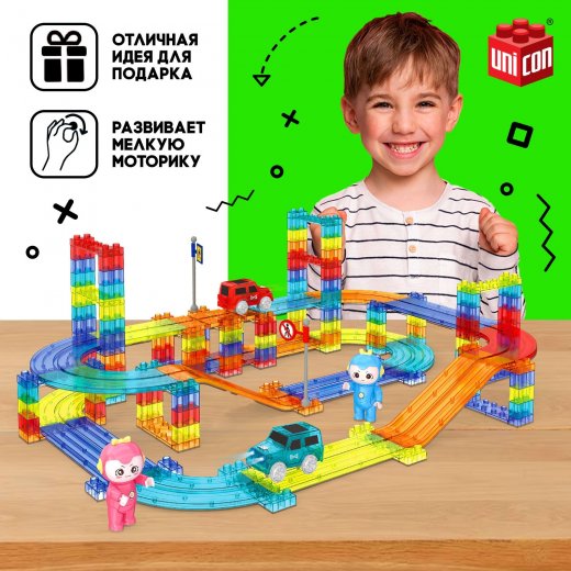 С яркими деталями в виде отдельных блоков дороги ребёнок будет создавать уникальные трассы для гоночных заездов. Придумывая каждый раз новые сооружения, малыш окунётся в мир креативного конструирования.