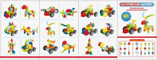 Магнитный конструктор "Магический магнит" состоит из разноцветных 65 деталей, с помощью которых ребенок может собрать пушку, автомобиль, оленя и другие фигурки, которые подскажет ему фантазия. Необычность конструктора заключается в том, что его детали крепятся между собой за счет притяжения магнитов. Крепление получается довольно надежным, что позволяет играть с полученными конструкциями.