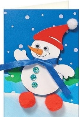 Снеговик – лучший друг снежной зимы и верный помощник Деда Мороза: вместе с ним Снеговик спешит к детишкам с поздравлениями и подарками, с пожеланиями счастья и радости. Это довольно занимательный подарок для юного создателя. Ребёнок сможет легко сделать такую открытку своими руками. Нужно лишь - вырезать простые детали, наклеить их послойно при помощи объёмного двустороннего скотча, приклеить игрушечные глазки, декорировать открытку помпонами, пайетками, атласной лентой. Ну а затем придумать и написать поздравление, положить послание в конверт – и поздравить кого он хотел больше всего. Вырезая детали у ребенка будет развиваться мелкая моторика рук и координация движений. Творческий процесс в целом будет способствовать развитию фантазии, образного мышления и усидчивости непоседы.