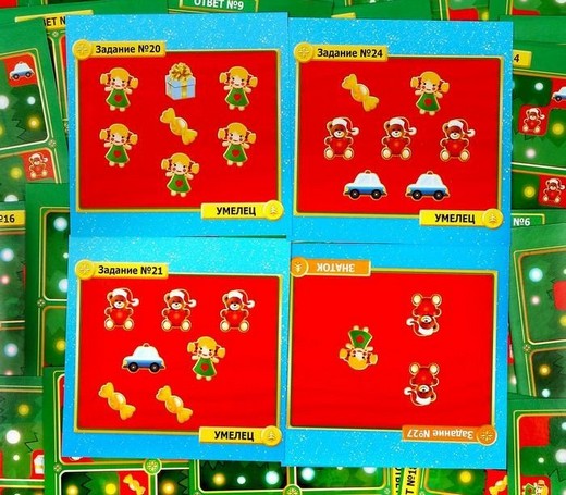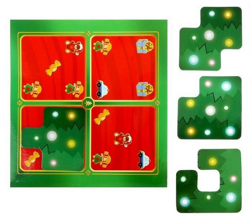 Вы получите карточку с заданием от эльфов. В набор входят магнитные детали и поле с изображением игрушек. Каждая из 4-х деталей имеет свою индивидуальную форму. Поместите элементы на игровом поле так, чтобы были видны только те предметы, которые указаны в задании. Все остальные изображения должны быть спрятаны. Существует только один вариант решения. А после смотрите ответ на обороте карты. Вот такая увлекательная задачка!