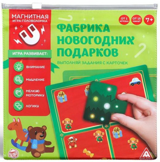 Магнитная игра Фабрика Новогодних подарков развивает логическое мышление, зрительное восприятие и внимание, воображение, пространственное мышление, терпение, усидчивость.