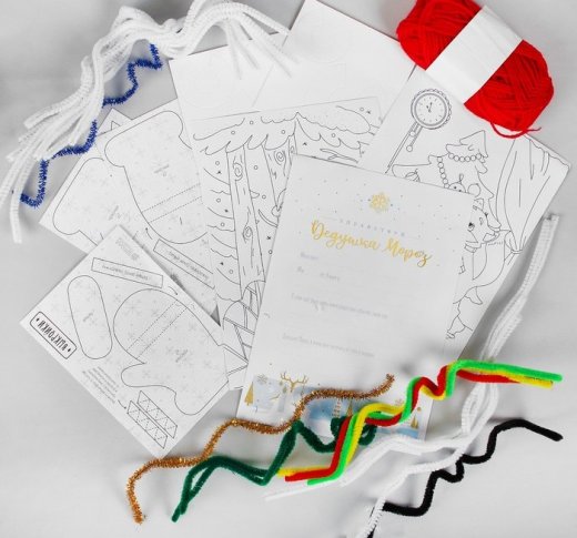 Состав набора: сказка, письмо Деду Морозу, инструкция, раскраски, 3D-шар, игрушка из фетра, фигурка с помпоном, пушистая игрушка, аппликации (фольгой, полубусинами, пластилином, пуговками), подарок – маска лисы.