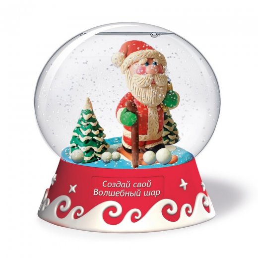 Состав набора: подробная инструкция, сферическая основа для шара, фигурная подставка для сувенира, цветной пластилин, доска для лепки, специальная жидкость, два вида блесток для создания снежного эффекта