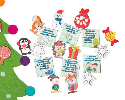 Сотав набора: основа из фетра Елка - 1шт.; мешочек из фетра с нумерацией - 31 шт.; деревянная фигурка-подарок - 31 шт.; ламинированные двустронние карточки - 4 шт.; новогодняя мега-раскраска - 1шт.; лист с заданиями - 1шт.