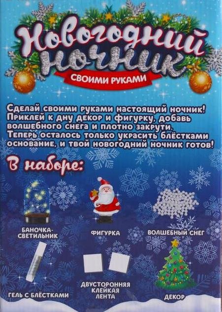 Набор поможет вам вместе с малышом увлекательно провести время и создать настоящий ночник своими руками. Приклейте ко дну декор и фигурку, добавьте волшебного снега и плотно закрутите. Декорируйте содержимое изделия и украшайте его с помощью геля с блёстками. И хотя это совсем не трудно, крохе придётся быть усидчивым и внимательным, совсем как взрослому! Готовый ночник ребёнок может преподнести в качестве подарка.