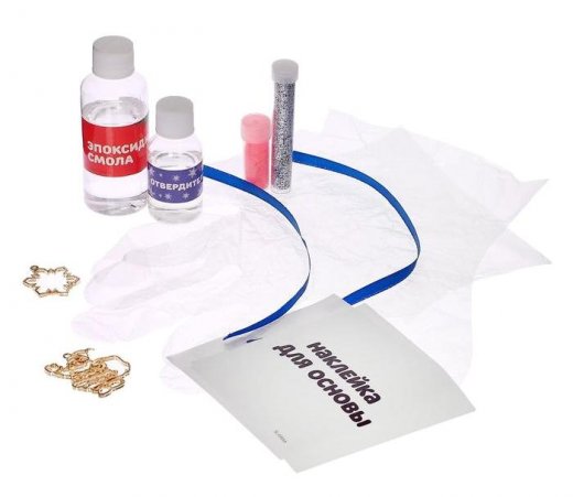 Состав набора: 2 основы, 2 ленточки, эпоксидная смола, краситель, декор, наклейки для основы, отвердитель, инструкция.