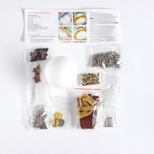 Состав набора: пенопластовый шар (7 см), атласная лента, бусины, шапочки для бусин, пайетки, декоративная тесьма, гвоздики-булавки, пошаговая инструкция.