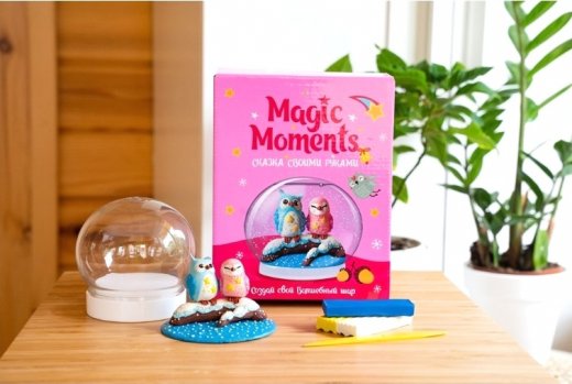Создайте чудесный маленький мир внутри волшебного шара: милых совушек, сидящих на ветке в заснеженном лесу. В наборе вы найдете все необходимое, чтобы создать свой Волшебный шар. Слепите фигурки, следуя простой пошаговой инструкции. Закрепите готовую композицию на подставке, добавьте в сферу воду, блестки и специальные жидкости. Волшебный шар готов!
