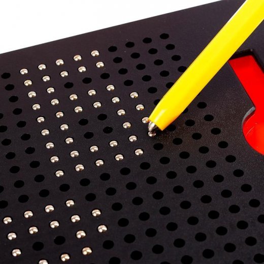 Игра «Магнитное рисование» поможет обучить ребёнка письму в дошкольном возрасте. В комплект входит планшет с железными шариками внутри и ручка-магнит. Поверхность для рисования состоит из небольших отверстий. Если провести по ним стиком, шарики притянутся, заполнят собой дырочки, получится линия. Стоит провести ладошкой по полю — и оно снова станет чистым.