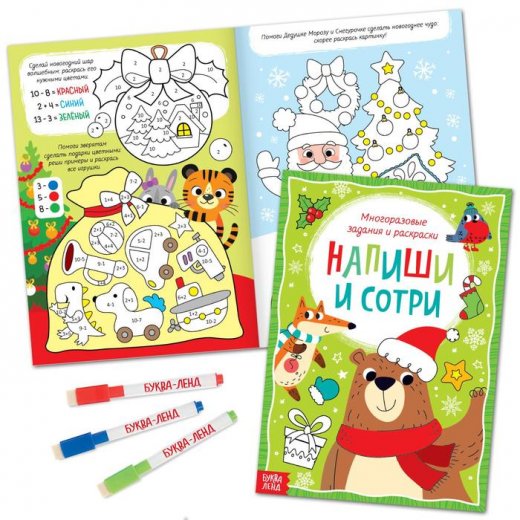 - Многоразовая книга с заданиями «Напиши и сотри» 12 стр. + 3 цветных маркера.