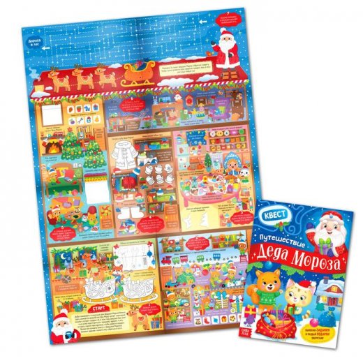 В наборе есть гигантский плакат-квест. Малышу предстоит помочь Деду Морозу поздравить всех с Новым годом.