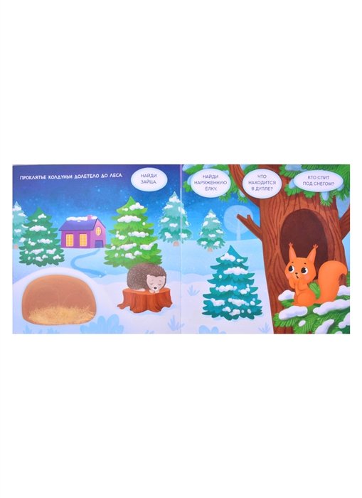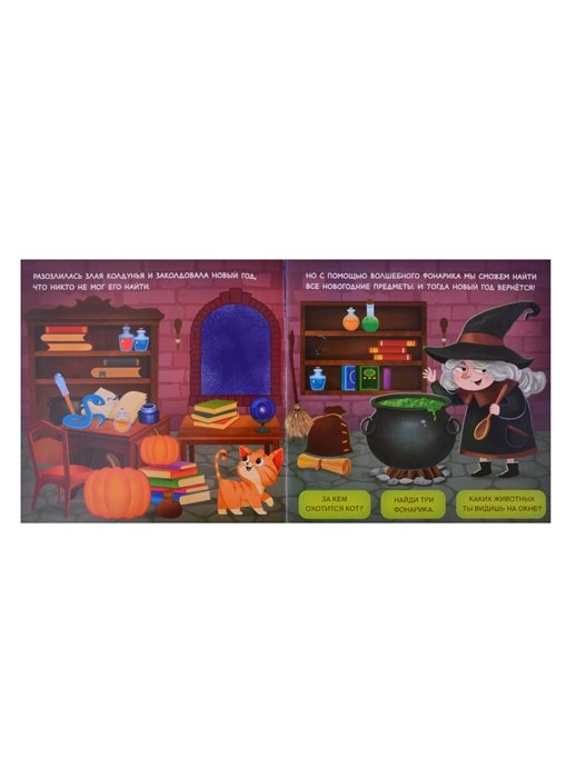 Приглушите свет и начните чтение. Чтобы выполнить задание на странице, включите чудесный фонарик и направьте голубоватый луч на картинки. На иллюстрациях становятся видны скрытие вещи и герои.