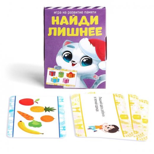 - «Найди лишнее» — ищите лишние предметы или персонажей на карточках. С помощью этой игры ребёнок научится группировать предметы по общему признаку.