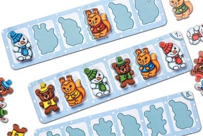 5. Игра «Зимние прятки». Возьмите 4 фигурки персонажей, попросите ребенка разместить их в рамке-вкладыше «Зимний лес» и запомнить их расположение. После того, как ребенок закроет всех персонажей фигурками деревьев, попросите вспомнить, кто спрятался за первым деревом, последним деревом?