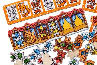 4. Игра «Вкладыши». Достаньте нижний выдвижной ящик с рамками-вкладышами. Предложите ребенку спрятать, например, снеговика в желтой одежде в рамке с елочкой, в рамке с деревьями спрятать зайчиков, а в домиках поселить зверят в одежде одинакового цвета (например, красного цвета).