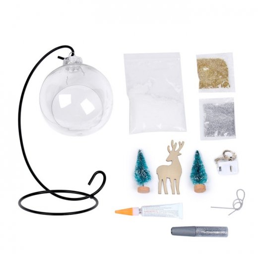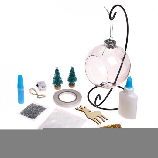 В наборе: металлическая подставка, шар-основа, деревянная фигурка, клей, двусторонняя клейкая лента, блёстки, декор, светящаяся гирлянда.