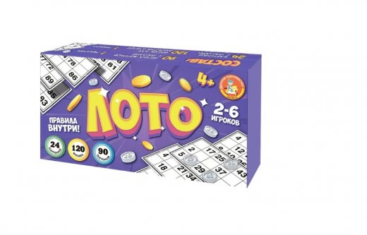 Лото для детей и взрослых (с пластиковыми жетонами) - это вариант Русского лото с пластиковыми жетонами с номерами вместо деревянных бочонков. Благодаря своей легкости и компактности игру можно брать с собой в гости. В игре могут участвовать от 2 до 6 игроков.