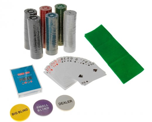 Состав: Две колоды игральных карт, Игральное сукно размером 60х90 см. для покера и блек-джека, Фишки номиналом 1,5,10,25 и 50 €, Фишки Dealer, Small Blind, Big Blind, правила игры.
