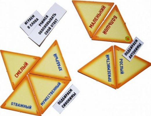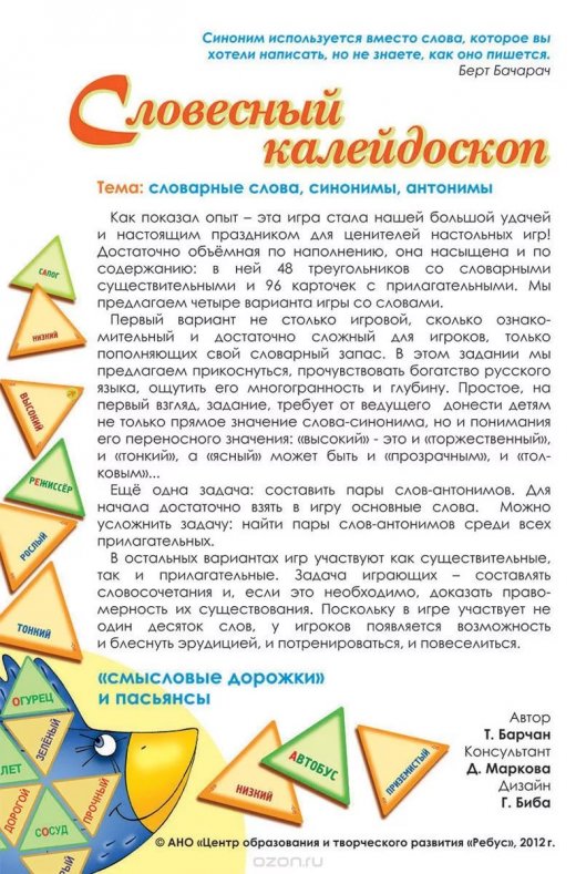 Словесный Калейдоскоп - -эта игра стала нашей большой удачей и настоящим праздником для ценителей настольных игр! Достаточно объёмная по наполнению, она насыщена и по содержанию: в ней 48 треугольников со словарными существительными и 96 карточек с прилагательными.
