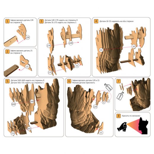 Это оригинальные 3D конструкторы (сборные модели) 5CULT. Каждый комплект изготовлен из пищевого гофрокартона – нетоксичного, экологически чистого материала, пригодного для повторного использования. А каждая деталь вырезана и прономерована при помощи высокоточной лазерной резки. Конструктор легко собрать по прилагаемой инструкции.