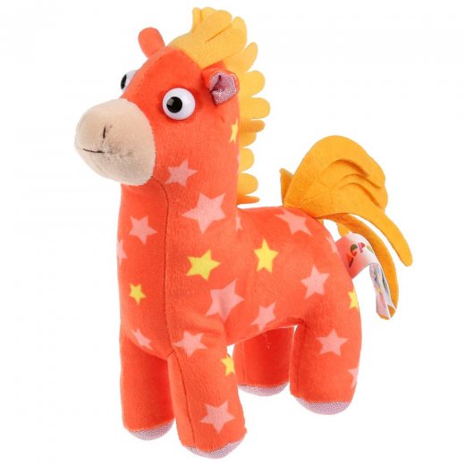 Милая ярко-оранжевая лошадка с весёлым принтом из звёздочек сразу понравится ребёнку, ведь с ней он сможет придумать множество интересных игр. С уже знакомым и любимым персонажем из мультфильма ребёнку будет интересно и весело играть.