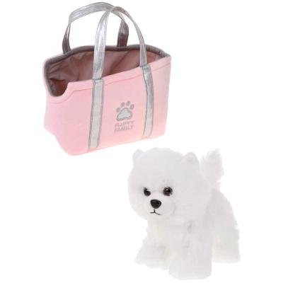 Это не просто модная сумочка, а сумочка с сюрпризом! Внутри неё прячется красивая мягкая игрушка – белоснежный щенок Шпиц. Сумочка адаптирована как раз под размер очаровательного питомца. Его будет удобно взять с собой в гости к подружке или на прогулку. Сумка выполнена в нежно-розовом цвете и акцентирована серебристыми деталями: двумя ручками и фирменным принтом Fluffy Family.