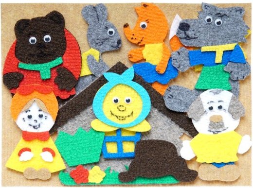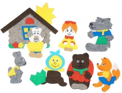 Состав набора: игровое поле (25 х 35 см), изба, дед, бабка, колобок, волк, заяц, медведь, лиса