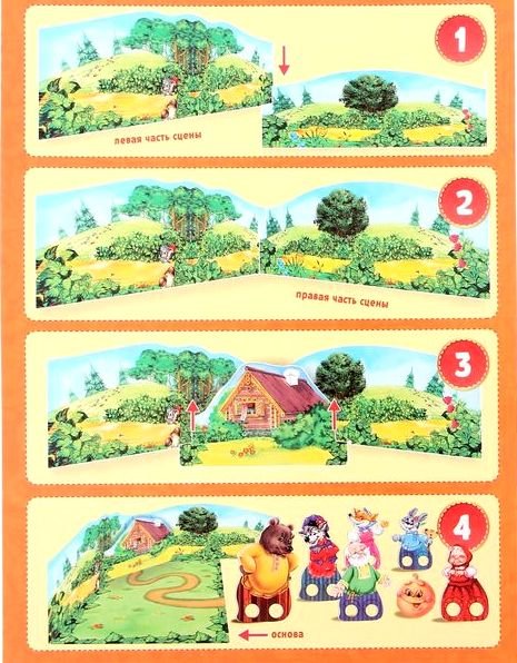 Состав набора: персонажи сказки, декорации, сценарий, инструкция по сборке.