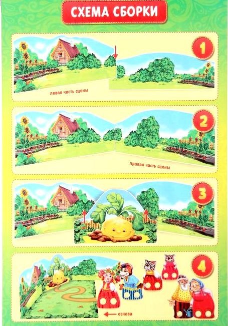 Состав набора: персонажи сказки, декорации, сценарий, инструкция по сборке.