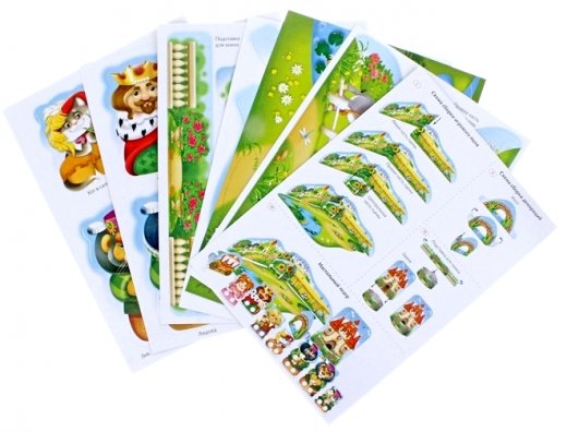 Состав набора: персонажи сказки, декорации, сценарий, инструкция по сборке.