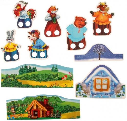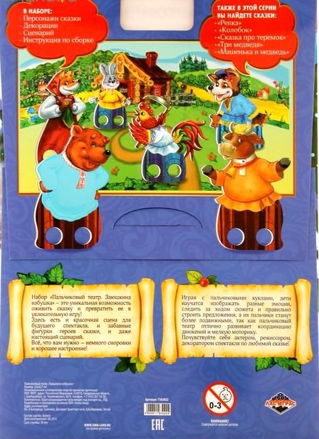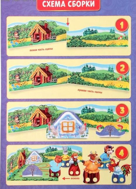 Состав набора: персонажи сказки, декорации, сценарий, инструкция по сборке.