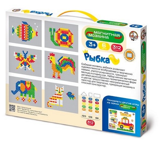 Магнитная мозаика "Рыбка"- это увлекательная игра, которая нравится всем детям без исключения. Детали как по волшебству крепятся к игровому полю, образуя различные конструкции. В наборе 312 деталей разных форм и 6 цветов-красного, белого, синего, оранжевого зеленого и желтого. С их помощью можно собрать множество фигур и сюжетных линий, количество которых ограничивается лишь фантазией ребенка. Цветные элементы разной геометрической формы оснащены магнитными вкладышами и легко крепятся к гладкой металлической поверхности. На коробке имеются примеры изображений, которые можно собрать из деталей мозаики - рыбка, улитка, слон, бабочка и другие.