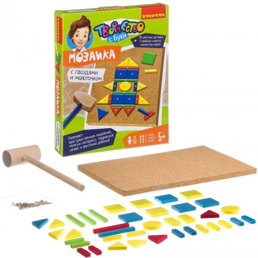 Набор для творчества Bondibon Мозаика с гвоздями и молоточком 2 - это увлекательная игра предполагает создание картинок из деталей, прикрепляемых к основе с помощью гвоздиков. Чтобы прикрепить деталь к основе, нужно аккуратно вставить в нее гвоздик и прибить его молоточком к основе. Особых усилий не требуется, детали и пробковая основа мягкие, поэтому гвоздики легко входят в них. Также легко разобрать созданные картинки.