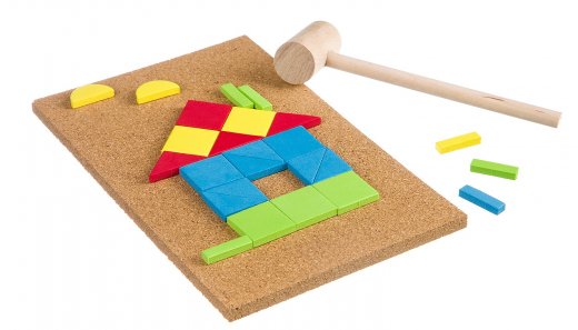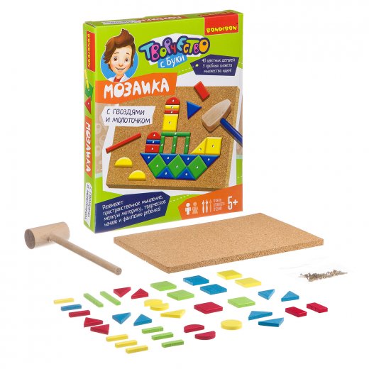 Увлекательная игра по созданию картинок из деталей, прикрепляемых к основе с помощью гвоздиков. В состав входят пробковая основа, молоточек, гвоздики, яркие детали из EVA разной формы и инструкция с картинками-примерами. Чтобы прикрепить деталь к основе, нужно аккуратно вставить в нее гвоздик и прибить его молоточком. Особых усилий не требуется, детали и пробковая основа мягкие, поэтому гвоздики легко входят в них. Также легко разобрать созданные картинки.