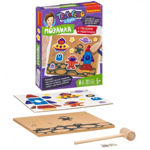 Мозаика с гвоздями и молоточком Космос развивает творческий потенциал ребенка, способствует тренировке мелкой моторики, глазомера ребенка, внимания, памяти, знакомит с окружающим миром, с цветом и разнообразными формами.